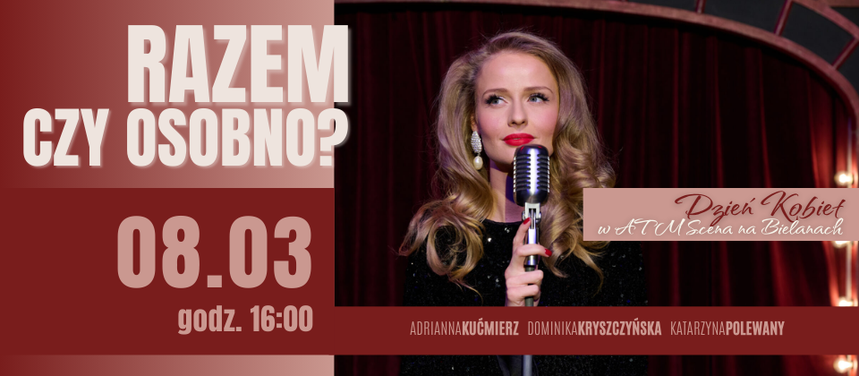 Dziś zapraszamy na wyjątkowy wieczór z kobiecą siłą. Na naszej scenie spektakl „Razem czy osobno?”, który przeniesie nas w świat skomplikowanych damsko – męskich relacji. Nie zabraknie wzruszeń, miłosnych historii, tańca i różańca, ale przede wszystkim nie zabraknie emocji i …śmiechu! Informujemy również, że z przyczyn niezależnych od ATM Scena na Bielanach w zastępstwie Anny Czartoryskiej wystąpi Adrianna Kućmierz – aktorka i wokalistka, absolwentka AST w Krakowie na specjalności wokalno-aktorskiej, laureatka Grand Prix Studenckiego Festiwalu Piosenki w Krakowie. Występowała na deskach Teatru Słowackiego w Krakowie oraz Teatru Polskiego i Teatru Kamienica w Warszawie, a obecnie można ją zobaczyć na scenach teatrów Syrena i Capitol w Warszawie. Gra również w serialach telewizyjnych i użycza głosu postaciom z gier komputerowych. Komponuje i pisze teksty piosenek, gra na fortepianie, gitarze i ukulele, w 2022 r. wydała autorską płytę pt. „Stanę się ziemią”.
